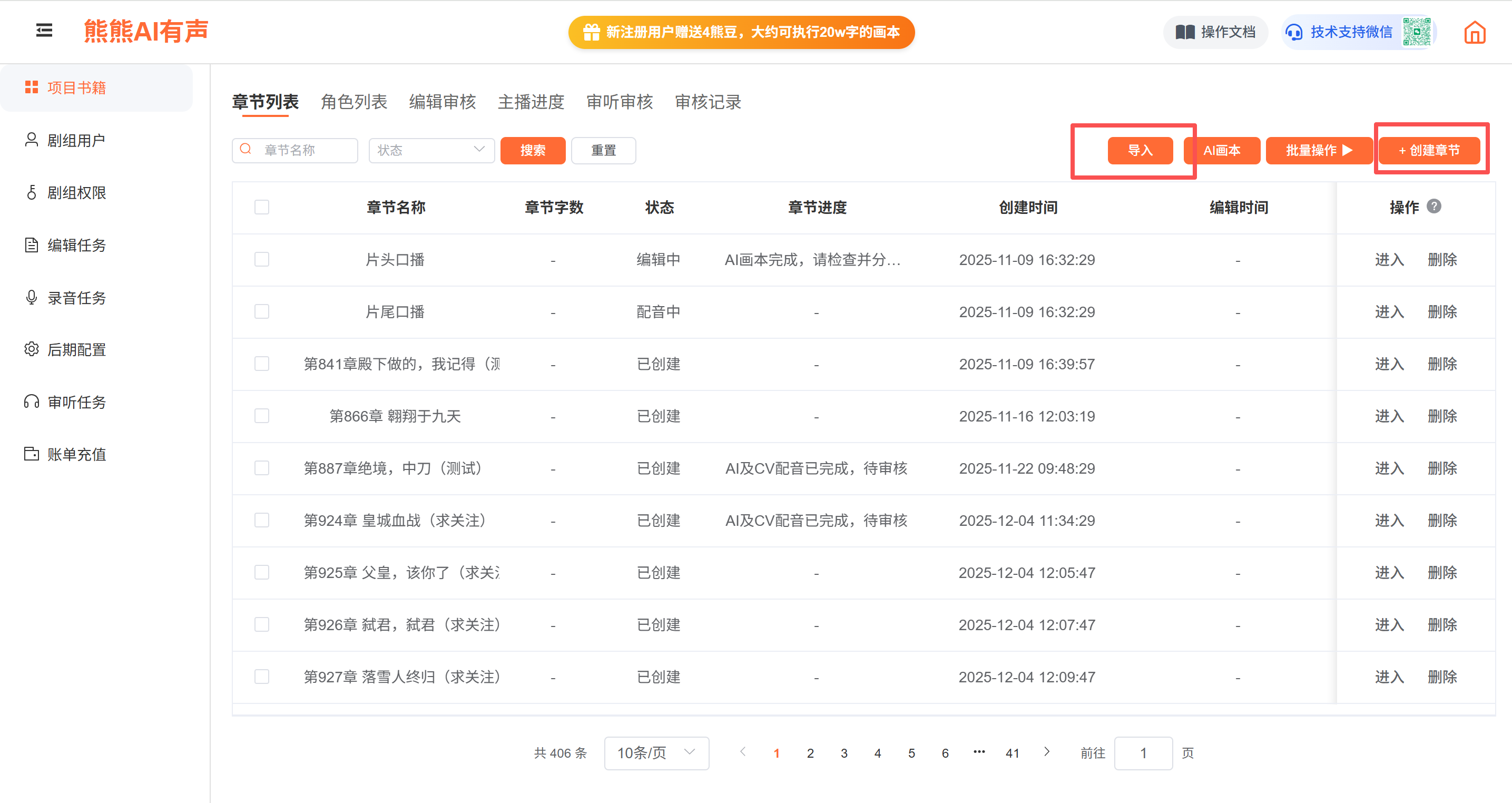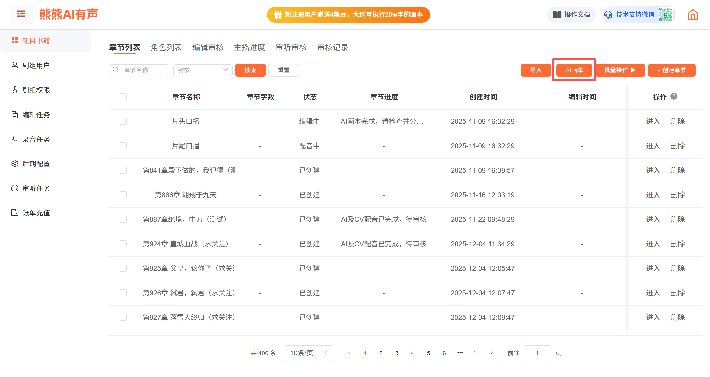管理员选中章节点击AI画本后,该章节会自动发布编辑任务,编辑人员可以在编辑任务中查看该章节,进行角色、音乐、音效等处理