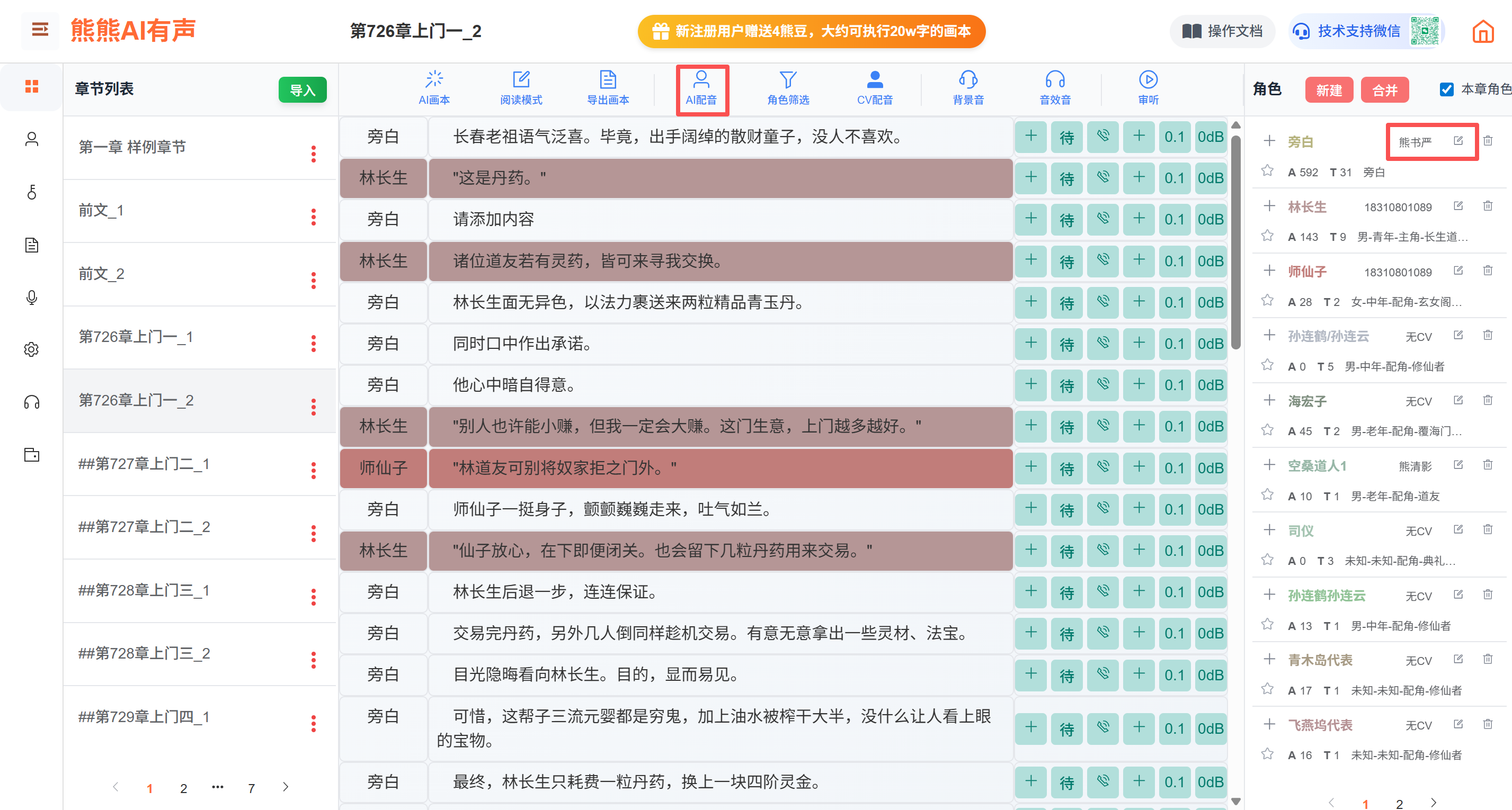 5:生成AI配音。上侧点击“AI配音”按钮,会对本章节下所有的角色内容生成AI配音
