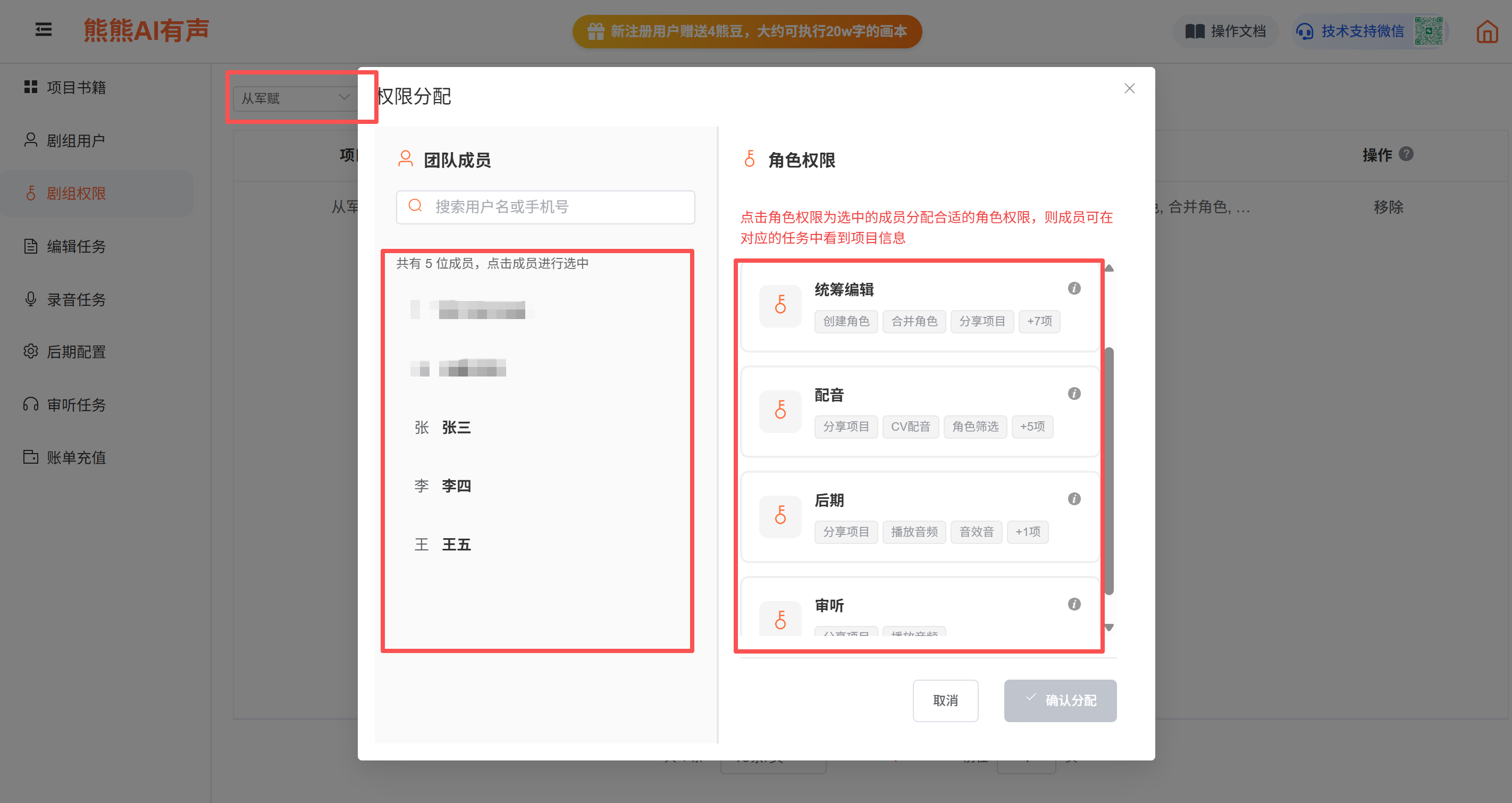点击角色权限为选中的成员分配合适的角色权限,则成员可在对应的任务中看到项目书籍