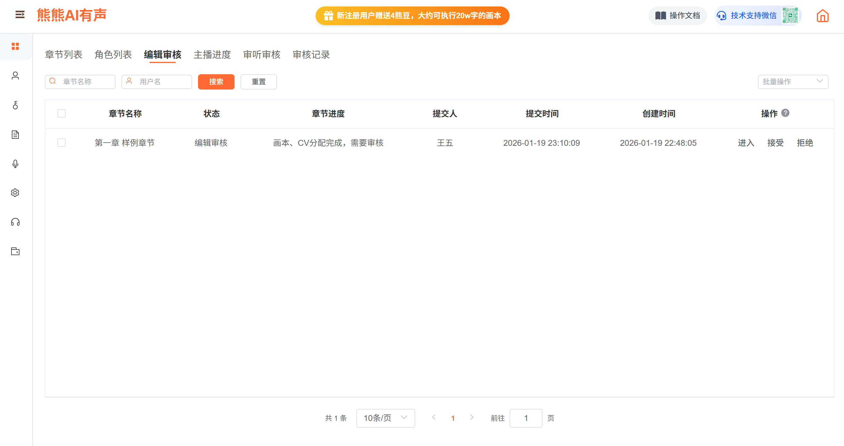 管理员审核编辑任务选中“接受”后,该章节会自动发布录音任务,录音人员可以在录音任务中查看该章节,进行配音