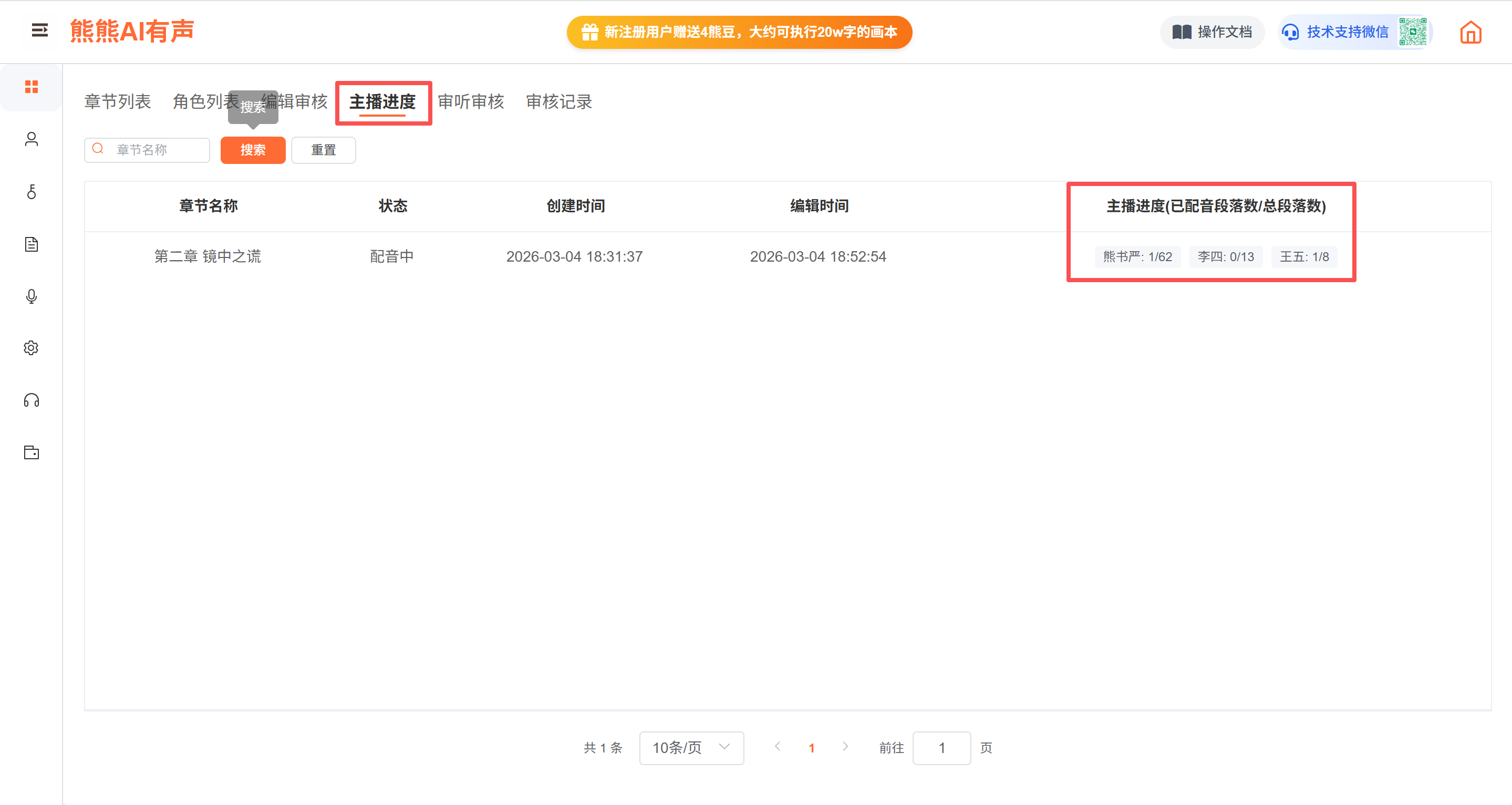 管理员可以看到该章节的各个主播录制进度(章节全部录制完毕后,则不显示)
