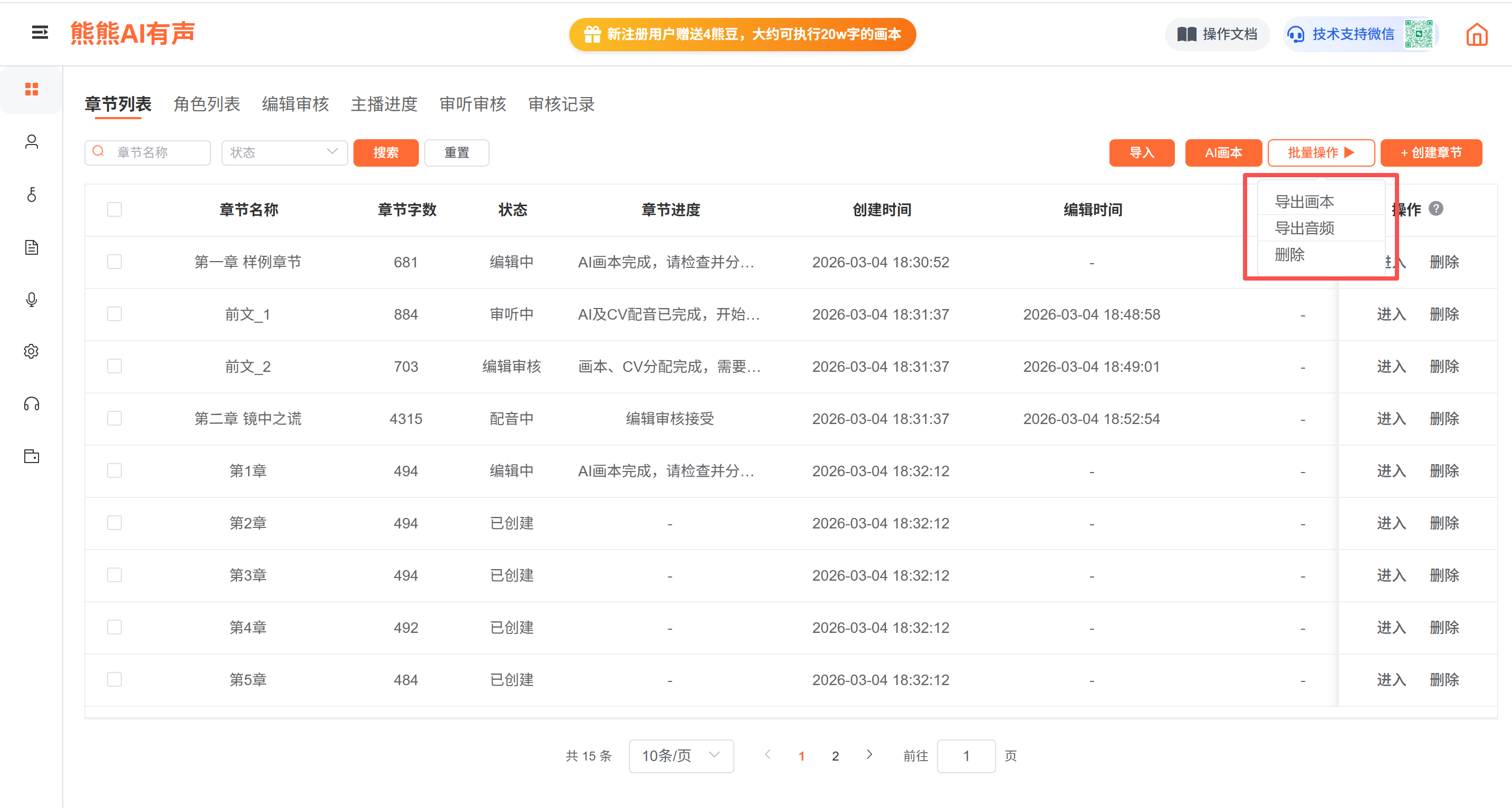 章节列表点击“进入”后,点击AI语音,则对章节内容的角色的“演播类型”是“AI演播”进行自动AI配音。此处会收取配音费用,具体价格去账单充值中查看